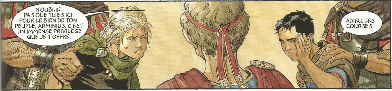 Dans le livre I de la série, Ermanamer, fils d’un chef de tribu germaine, est envoyé encore enfant comme otage à Rome. Là, Auguste romanise son nom en Arminius et le confie aux soins de l’ancien centurion Titus Valerius Falco. Une relation plus ou moins houleuse s’établit entre le jeune germain et Marcus, le fils du centurion, qui est à peu près du même âge.