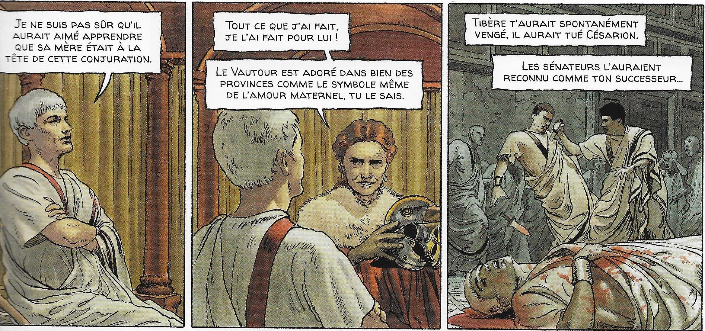 Passons maintenant au fils de Tiberius Claudius Nero et de Livie, Tibère (42 av. JC- 37 ap.JC) qui fut donc le second empereur de la dynastie julio-claudienne. Nous avons vu plus haut le début de son règne sous la houlette de sa mère dans les pp10-17 de ce livre VI. Mais il était déjà apparu dans la série sur une séquence documentaire à la p46 du livre II sorti en 2009.