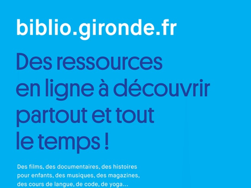 Grâce à Biblio.Gironde, service du Département de la Gironde, et à votre inscription dans le réseau des bibliothèques Latitude Nord Gironde, vous bénéficiez gratuitement d'un accès à des ressources numériques en ligne pour tous : films, documentaires, histoires pour enfants, musique, magazines, méthodes de langues ou encore plateforme d'auto-apprentissage, soutien scolaire, ….